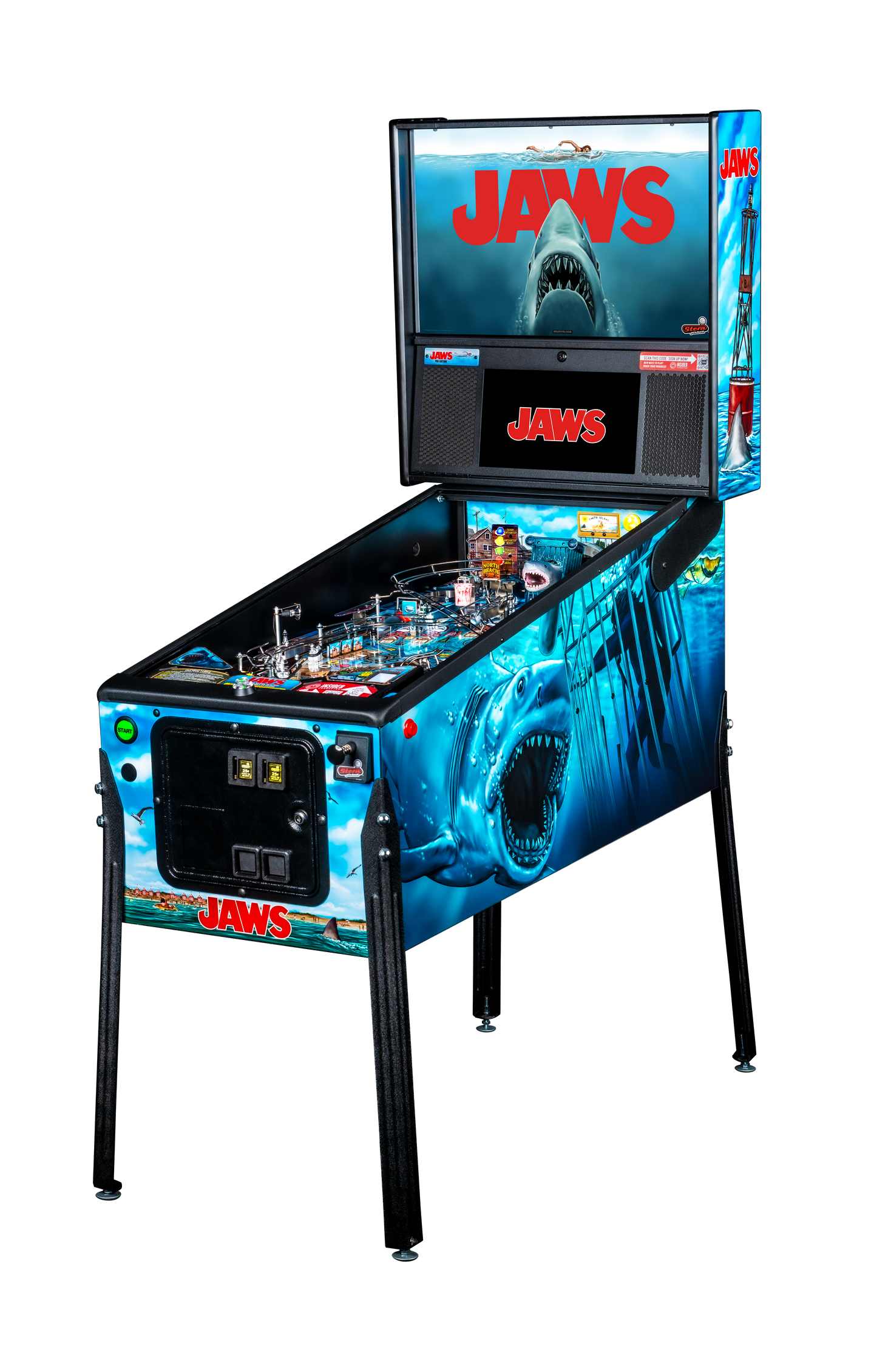 Stern's JAWS pinball transports players to Amity Island where they'll grab harpoons and play as Quint, Hooper, and Brody to save the Fourth of July from the ultimate ocean predator. This coin-op masterpiece features groundbreaking mechanical innovations including a motorized shark fin target with "blood in the water" effects, an interactive Orca boat upper playfield, and a massive custom-sculpted Great White Shark that crashes through a three-dimensional fishing boat. With immersive film footage from all four blockbuster films, custom speech by Richard Dreyfuss, and John Williams' iconic score, this is pinball's most cinematic experience.