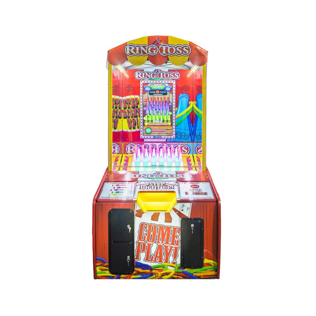 In addition to the colorful playfield, Ring Toss is equipped with a 32” LCD to add to the appeal and excitement.