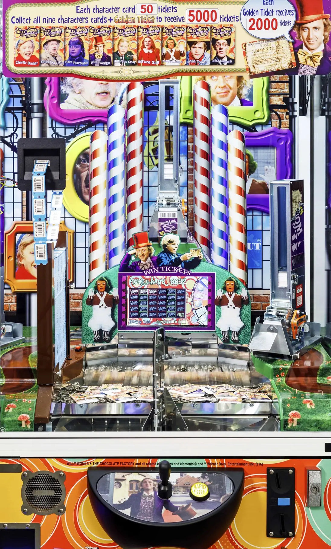 Officially licensed by Warner Bros., this vibrant arcade redemption game brings the iconic movie to life with stunning visuals, beloved characters, and addictive gameplay that keeps players coming back for more. Collect character cards, chase the elusive Golden Ticket, and trigger exciting bonuses in one of the most engaging coin pushers on the market.