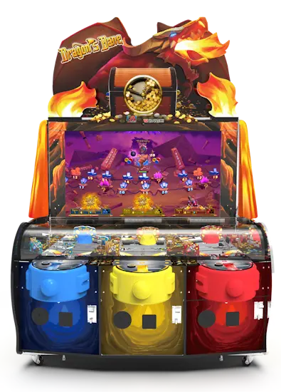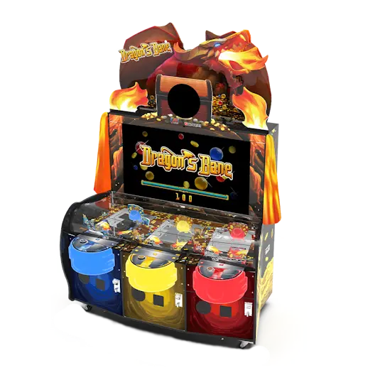 Dragon’s Bane is a stunning, dragon-themed three-player coin pusher with a thrilling mix of analog and digital gameplay! Guests attempt to launch coins into a loot bag to trigger the on-screen action. Fire the cannon ball at the dragon and portal for a chance to activate Party Time and the Loot Dash Mini Game to advance to the Mega Bonus Round.