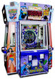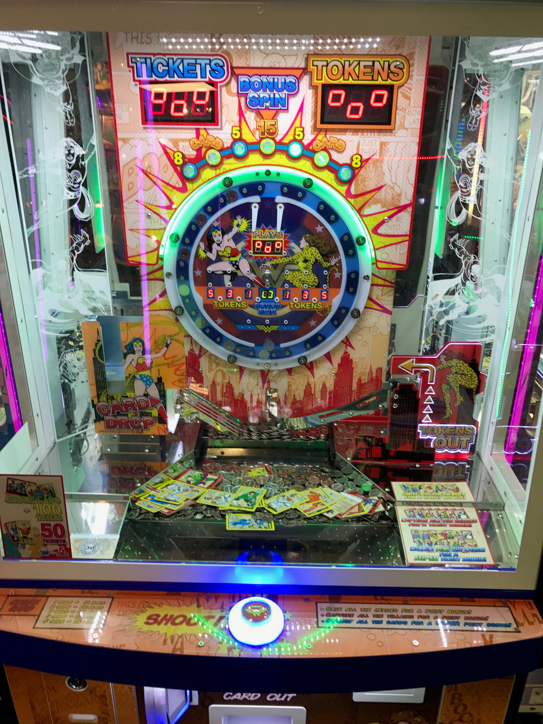 This new highly entertaining DC Superheroes arcade game is a Token + Card Pusher Arcade Game which the players try to press the "shoot" button to rotate the large wheel on the back wall of the cabinet and drop a token through a peg maze. If the player times it just right they can get the token through the "Bonus Drop" area of the maze which will stop the bonus spinner above it which will drop bonus tokens or cards onto the playfield in order for players to collect cards and win tickets !