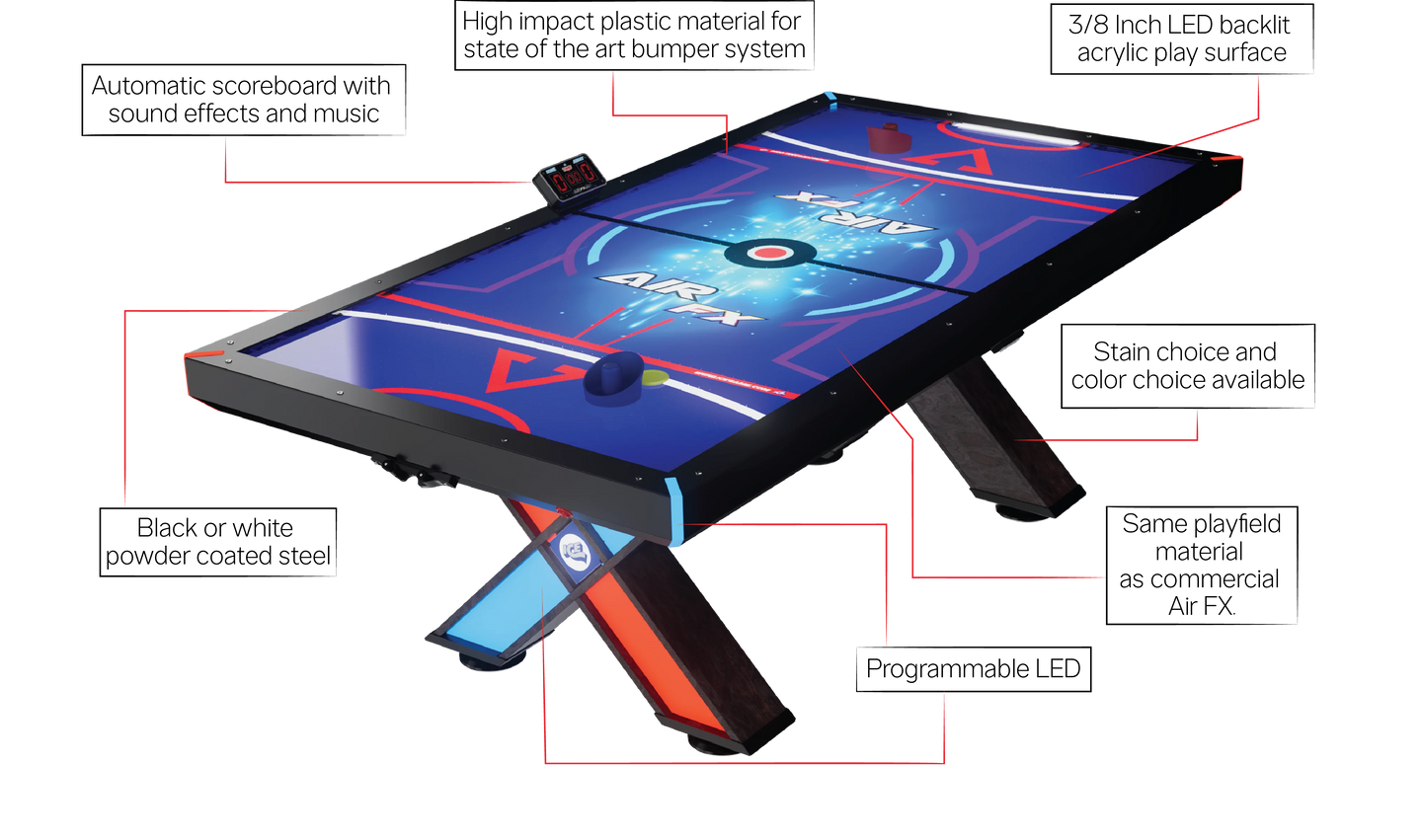 Air FX Pro features the same great design and build quality as our arcade Air FX. The beautiful backlit 3/8 Inch LED acrylic play surface is sure to look stunning in any space. Innovative new Phenolic material for state of the art bumper system allowing for a quieter game play.
