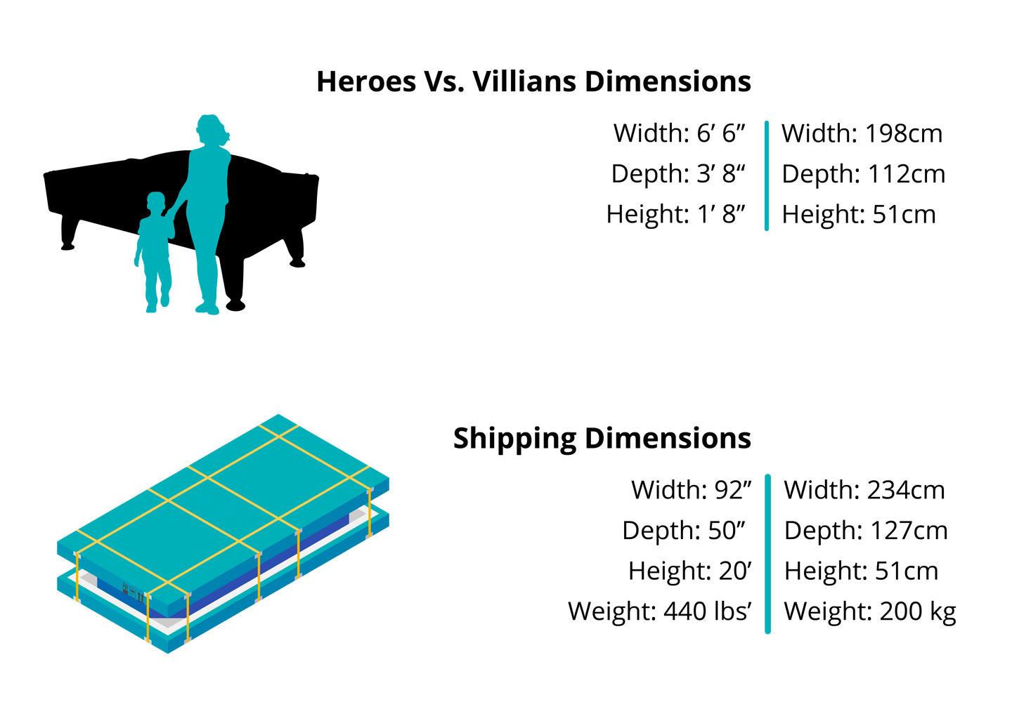 Choose your side, Heroes or Villains? Battle against the other team in this exciting new take on the classic air hockey design! This air hockey table features full motion LED lighting in the playfield, edge rails and in the legs to make this an attractive piece in any game room. The playfield will light up red or blue to let everyone know who has scored. This game also has exciting heroic gameplay music and action sound effects when the puck hits the table edges.