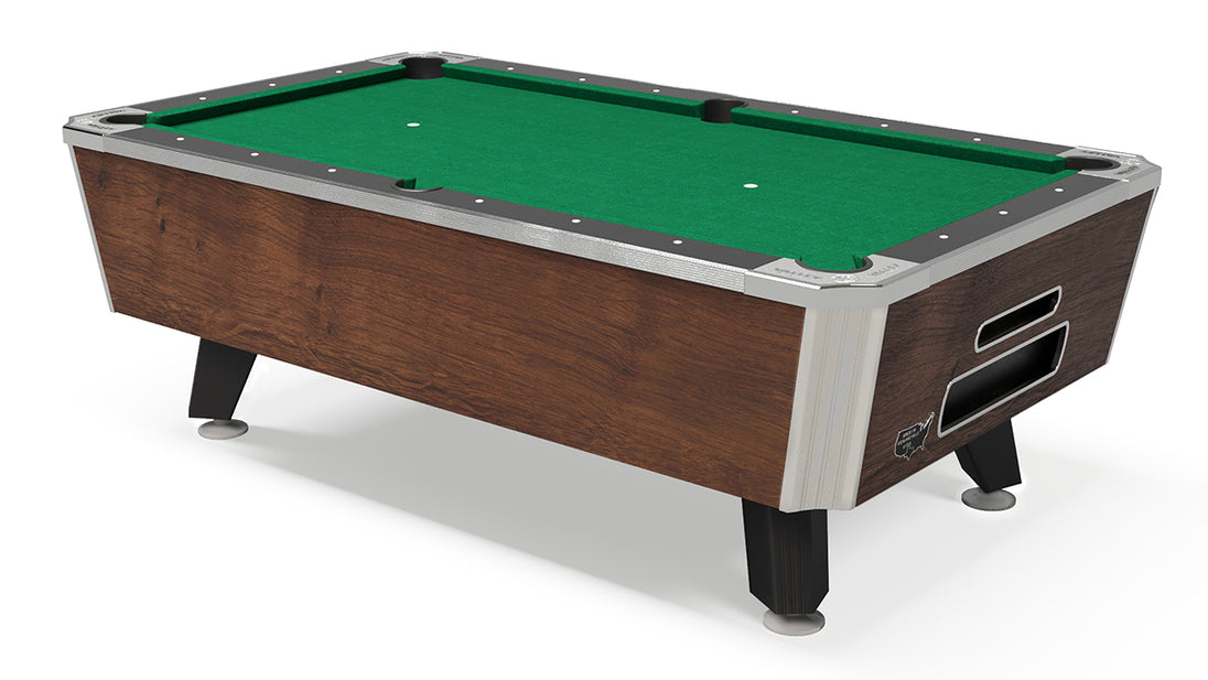 Now available in a non-coin model:  the tournament-tested Valley Panther is perfect for homes, game rooms and locations where coin play may not be a necessity; but durability, great looks and tournament quality play are a must. The Panther Home is now available in 3 colors, Highland Maple, Charcoal Chromatic, and Cherry laminate finish.  Each Valley Panther Home Table offers high-visibility white sights, concealed-screw side and end trim, and player-friendly flush-mount corners and pockets.  The Panther  Home models are available in 6.5ft, 7ft, and 8ft lengths.