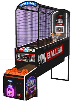 NBA Baller takes the classic hoops game you know and love and adds an exciting twist—the ability to function as a merchandiser, dispensing a seven inch officially licensed NBA ball when players beat the high score.