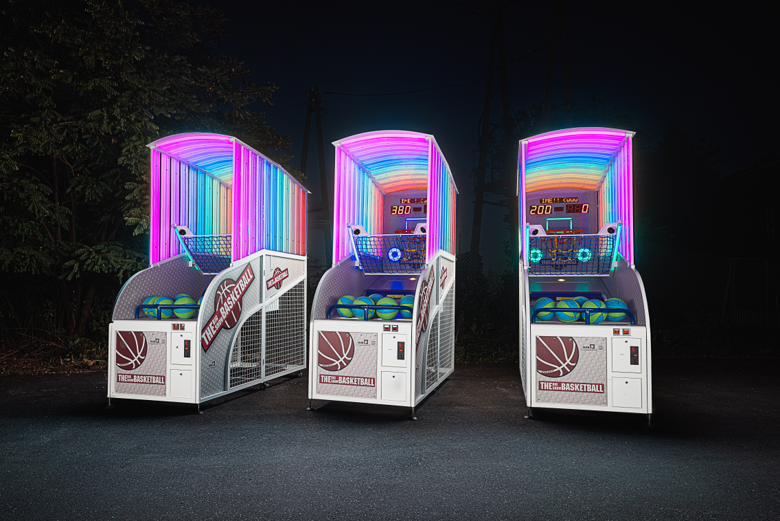 Our weatherproof basketball arcade machines can be used outdoor all year round. The game has four levels of difficulty and comes with a set of five balls. Depending on the mode selected, the basket can be movable. It also has interactive panels on the sides that react to the movements of the ball.