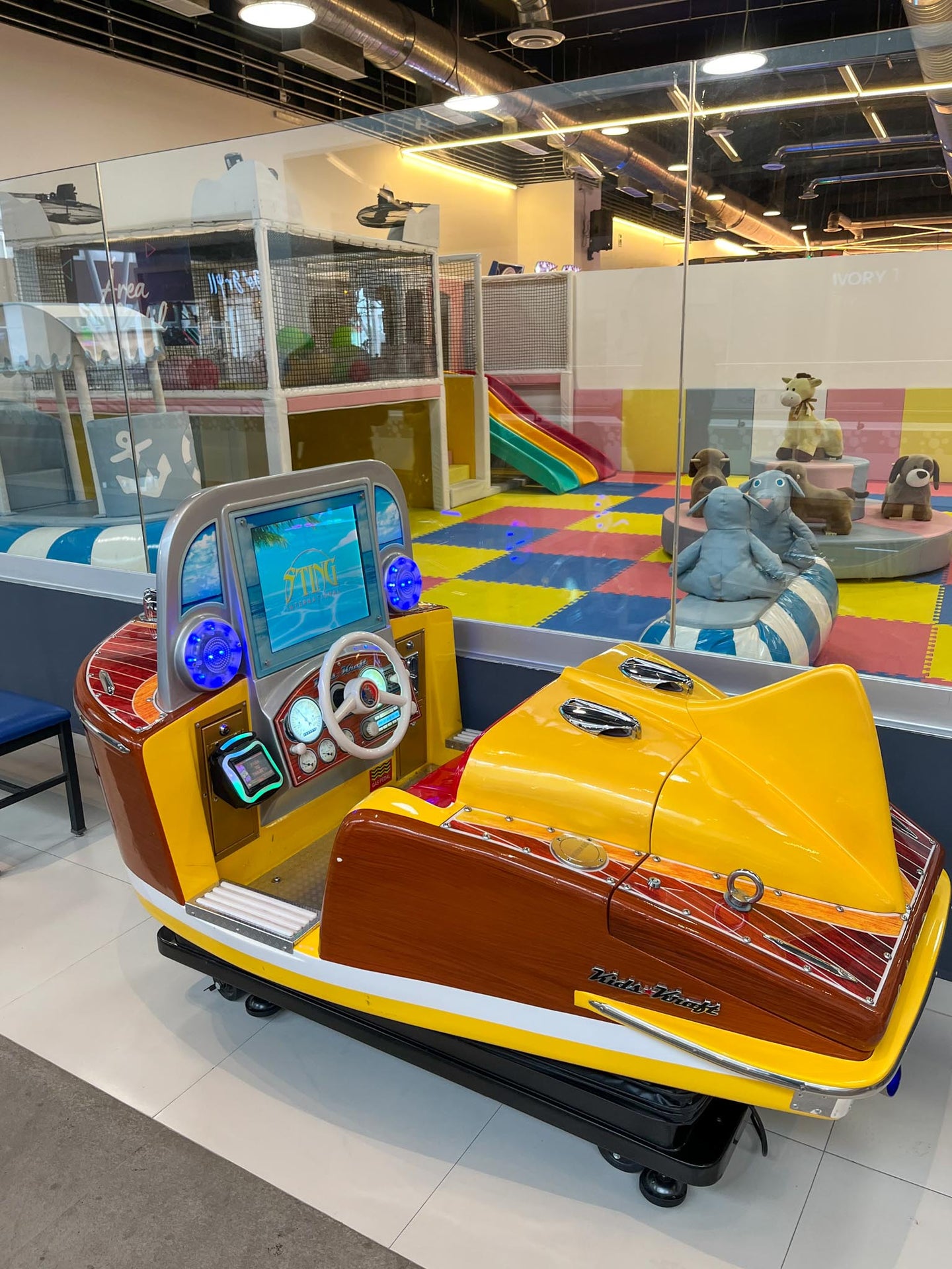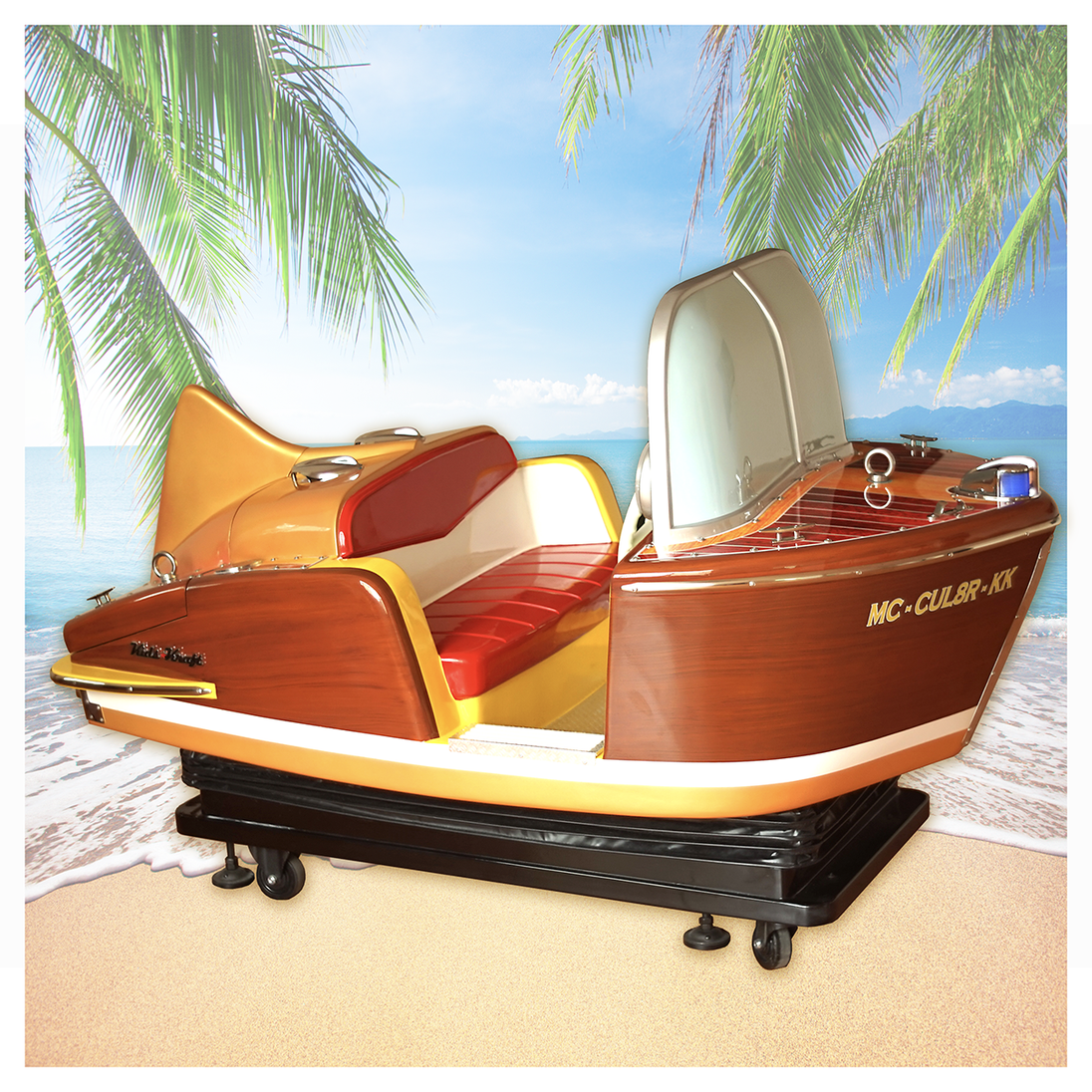 In Kids Kraft Cobra, boaters guide their classic speed boat around a course filled with treasures, all while pulling along a talented water skier who is trying to collect them all. Drivers steer their water skier towards ramps and hidden bonuses to collect valuable starfish This motion base ride offers realistic lighted gauges and trim, vintage 60’s audio, optional redemption ticket awards or dbv ready.