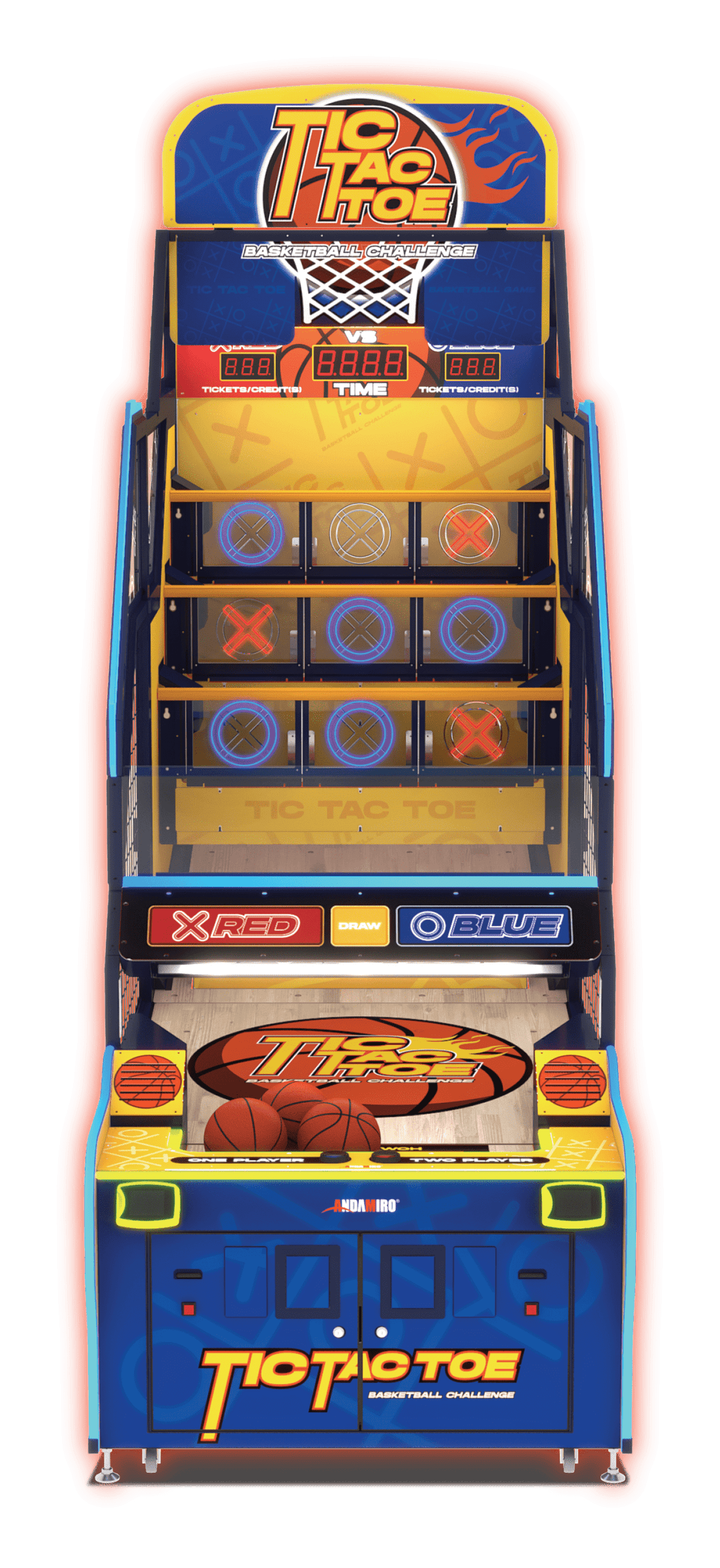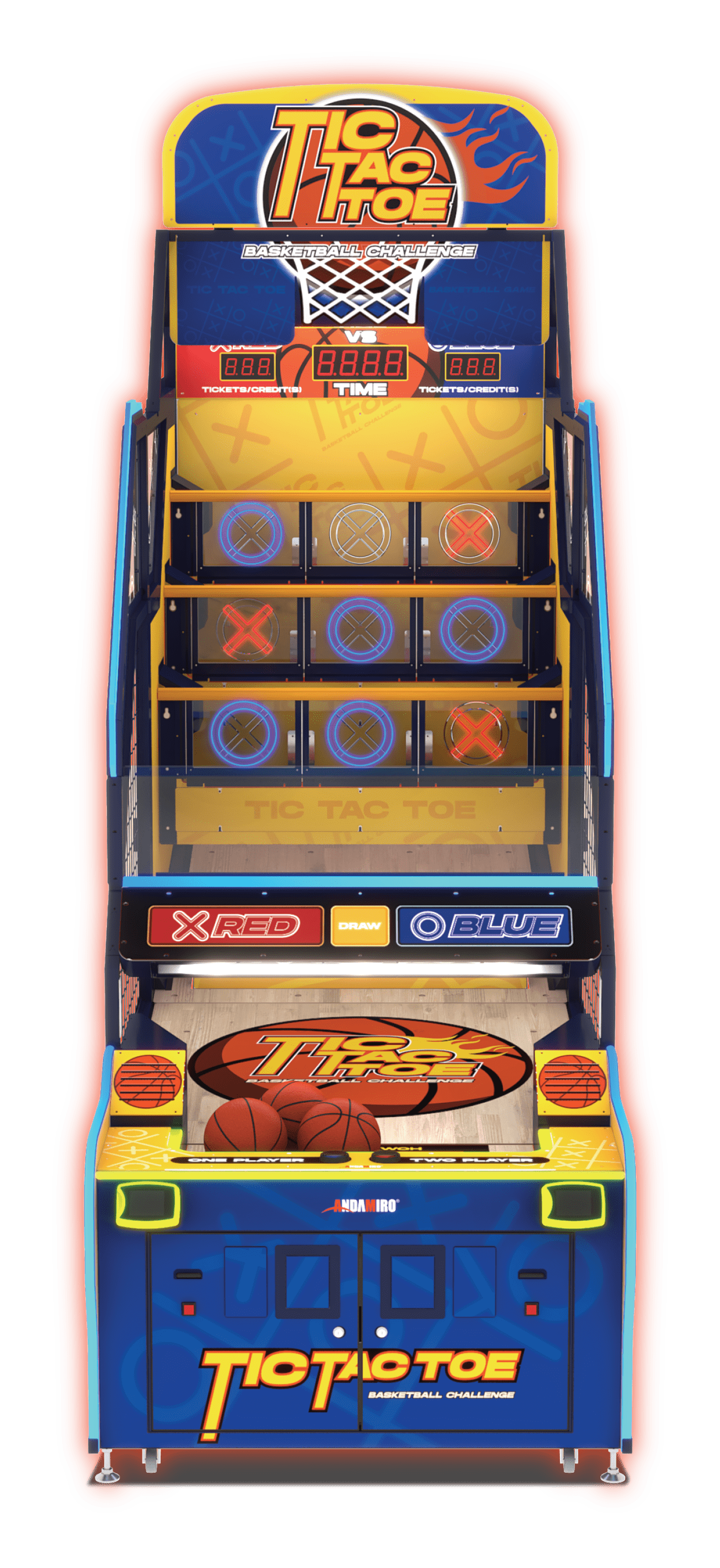 Tic Tac Toe Basketball Challenge joins Andamiro’s novelty hoops lineup, taking its place alongside the company’s Tic SHAQ Toe version. Like the company’s SHAQ version, Tic Tac Toe’s gameplay ingeniously blends the classic strategy of Xs and Os with basketball action, but in a basic, pure package perfect for adult or kid venues.