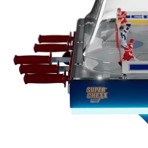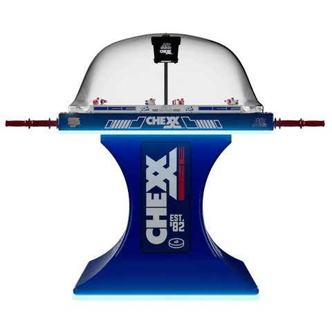 To commemorate our 40th Anniversary of CHEXX we are offering a limited production run on the original game that started this “cult” like following. Complete with the original BLUE base and RED grips along with our new and improved electronics, jumbotron scoring and amination, skated ice surface, underneath cabinet LED lighting and now with LED lighting incorporated into the actual base. Each ice surface will also be “numbered” to honor this great milestone.