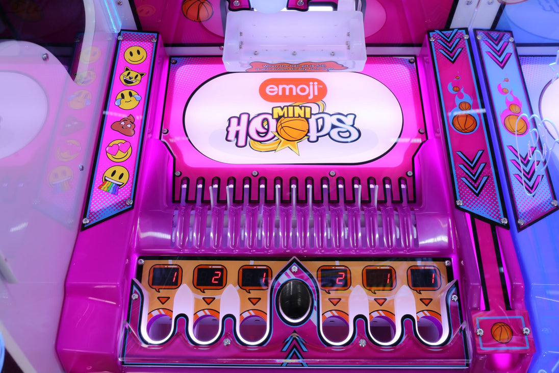 Shoot, score, and light up the fun with this 2-player basketball redemption game featuring the emoji™ brand. Players drop balls into the launcher to shoot at a moving hoop. Light up all 5 basketball emoji to activate the Lucky Bonus Wheel and earn extra points or balls.