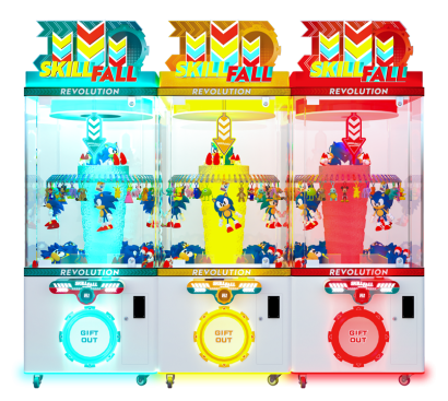 Introducing Skill Fall Revolution a stunning new, prize game from Sega Amusements International. With its striking combination of red, blue, and yellow cabinets, Skill Fall creates an irresistible visual spectacle. The vibrant LED header lighting, coupled with the modern see-through design and bright interior lighting, instantly captures players' attention in any arcade, FEC, or bowling center. The transparent cabinet allows guests to have a clear view into the arcade, making it a versatile unit that can be placed at the entrance or serve as a captivating centerpiece.