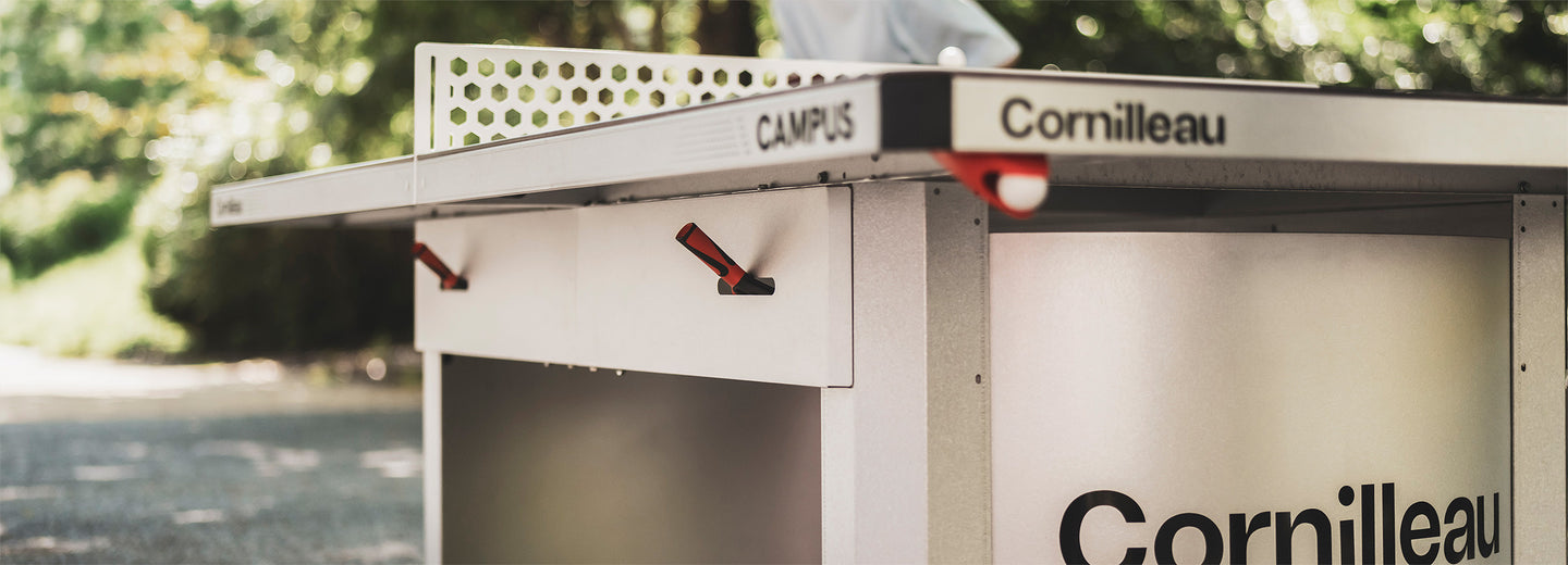 The preferred table for schools, resorts, hotels... the stationary Campus table is the perfect choice for open access settings. It can be fixed to the ground using the parts provided and can withstand loads of up to 1,750lbs. Its tamper-proof steel net is coupled with an impact resistance high pressure laminate playing surface. The Campus is able to withstand the most extreme weather conditions, thanks to the high quality materials used in its construction. All add up to a 10-year Cornilleau warranty. The 7mm thick top delivers excellent bounce and superior spin, so everyone can enjoy the ping-pong fun, even the most demanding players.
