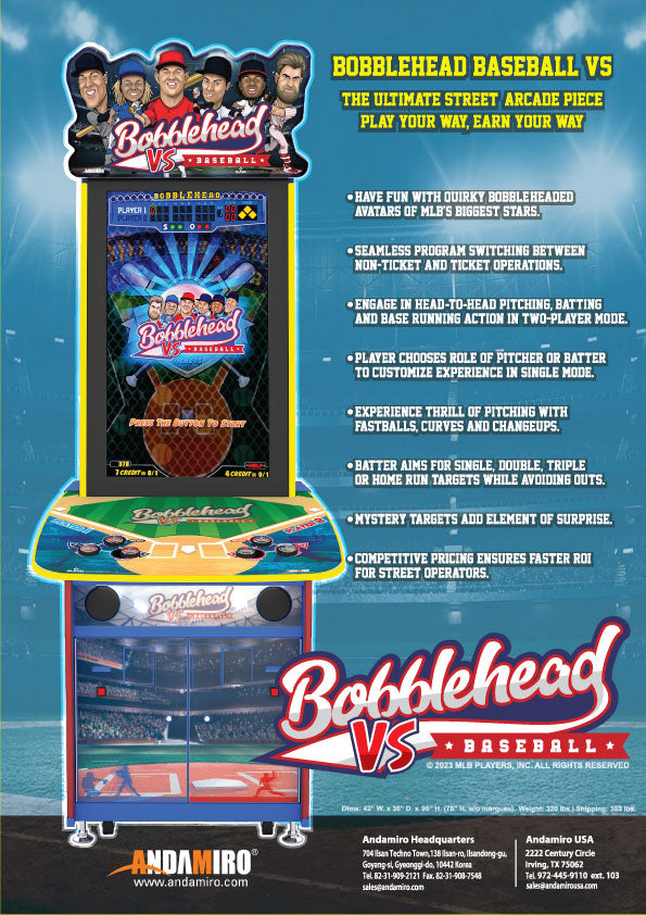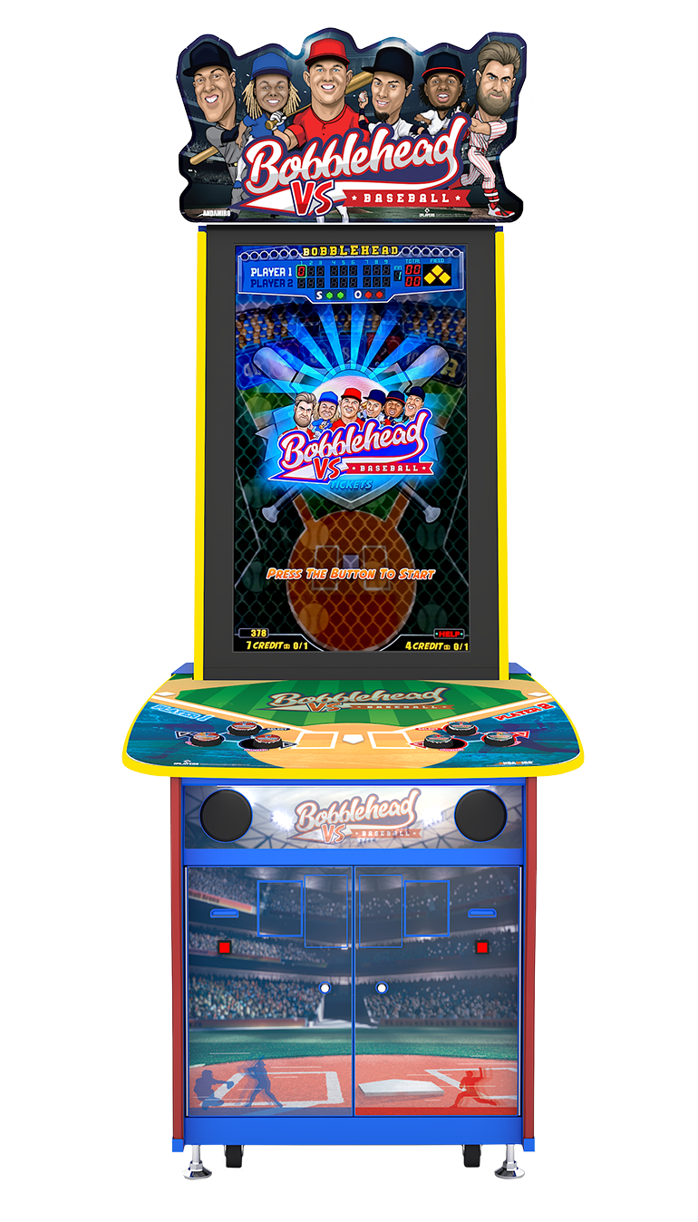Bobblehead Baseball VS by Andamiro delivers the perfect blend of sports entertainment with dual operating modes, letting you maximize revenue in any venue. This officially licensed MLB Players Inc. product features quirky bobble-headed avatars of Major League Baseball's biggest stars, dual player stations, and onboard program switching between non-ticket and ticket redemption operation. Built specifically for street operators and high-traffic venues, this videmption game combines authentic MLB action with operator-friendly design and competitive pricing for faster ROI.