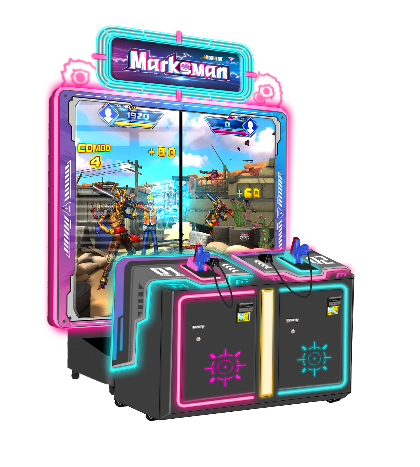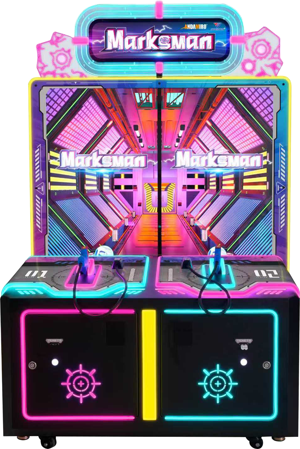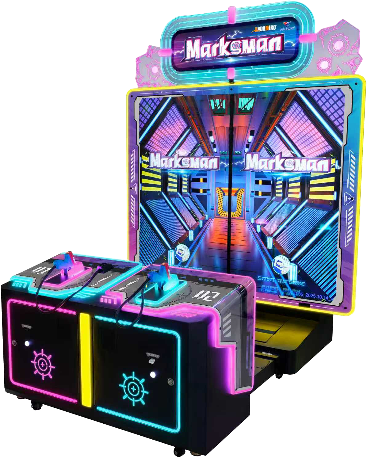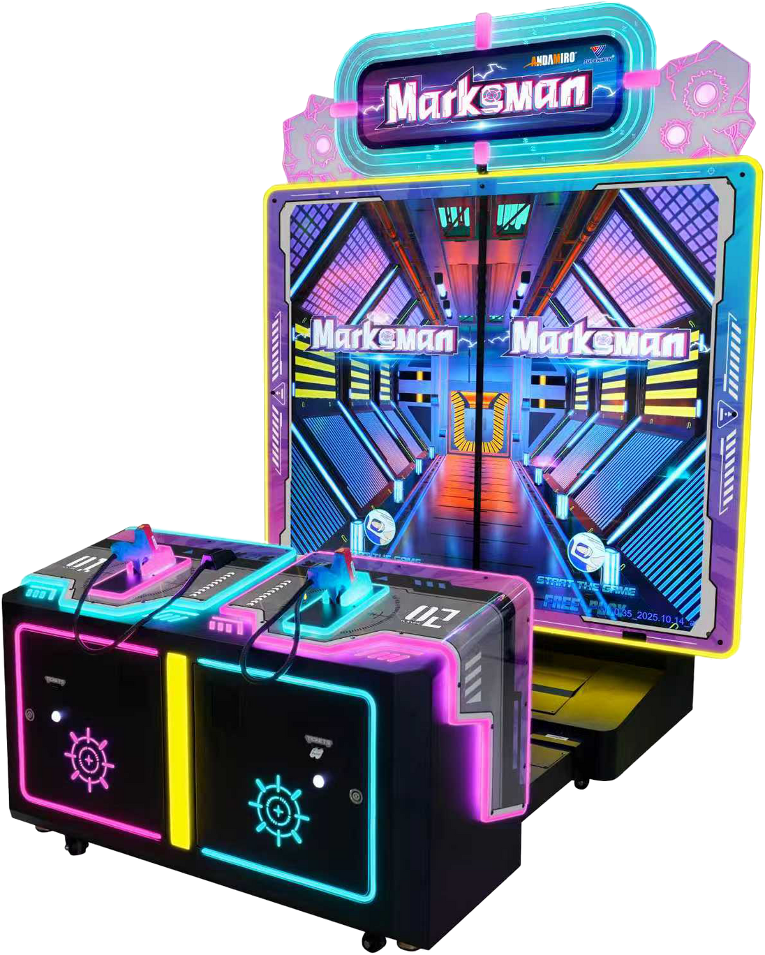 Andamiro's Marksman delivers authentic shooting action with pneumatic force-feedback guns and a massive 130-inch dual-screen display. This two-player powerhouse features 11 diverse missions spanning tactical operations, zombie battles, and classic gallery games, all designed to maximize player engagement and operator earnings through competitive gameplay and continuation buy-ins. Originally developed by Superwing and now production-ready through Andamiro USA, this gallery shooter represents the latest evolution in air-powered arcade entertainment.