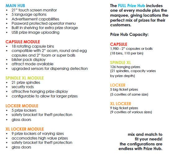 The fully modular customizable contactless prize redemption system. Prize Hub’s unique modular construction allows operators the flexibility to customize the perfect prize mix for their unique location. The Main Hub is the brain of the Prize Hub system which powers each module. With four unique modules, prizes of all sizes and values can be offered to your customers.