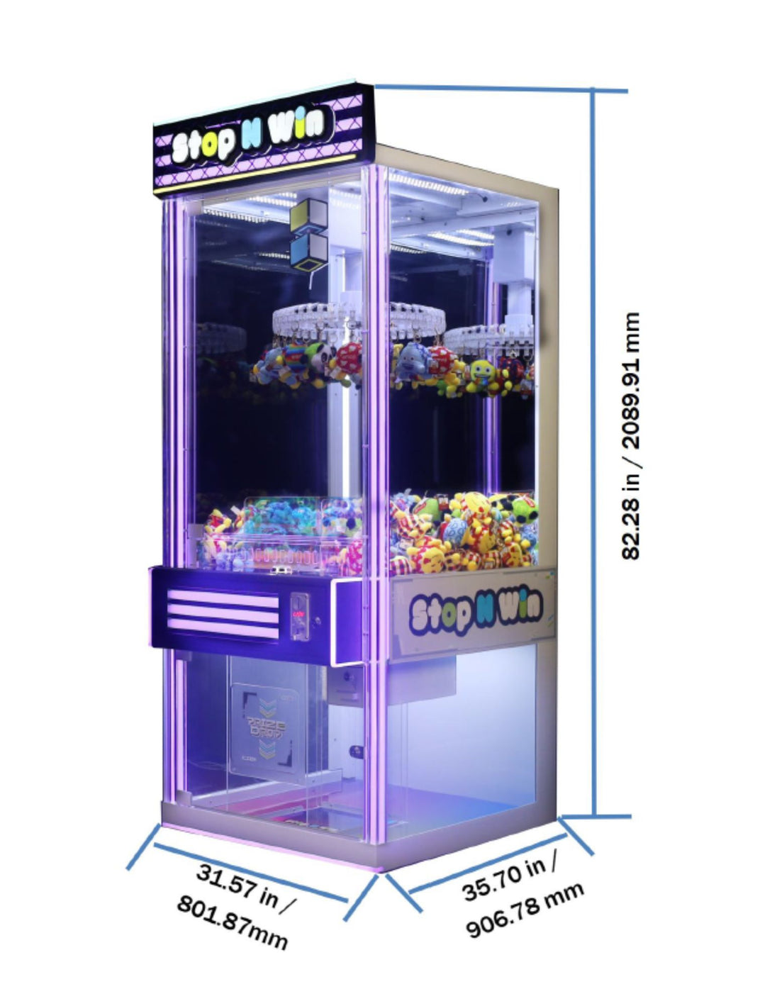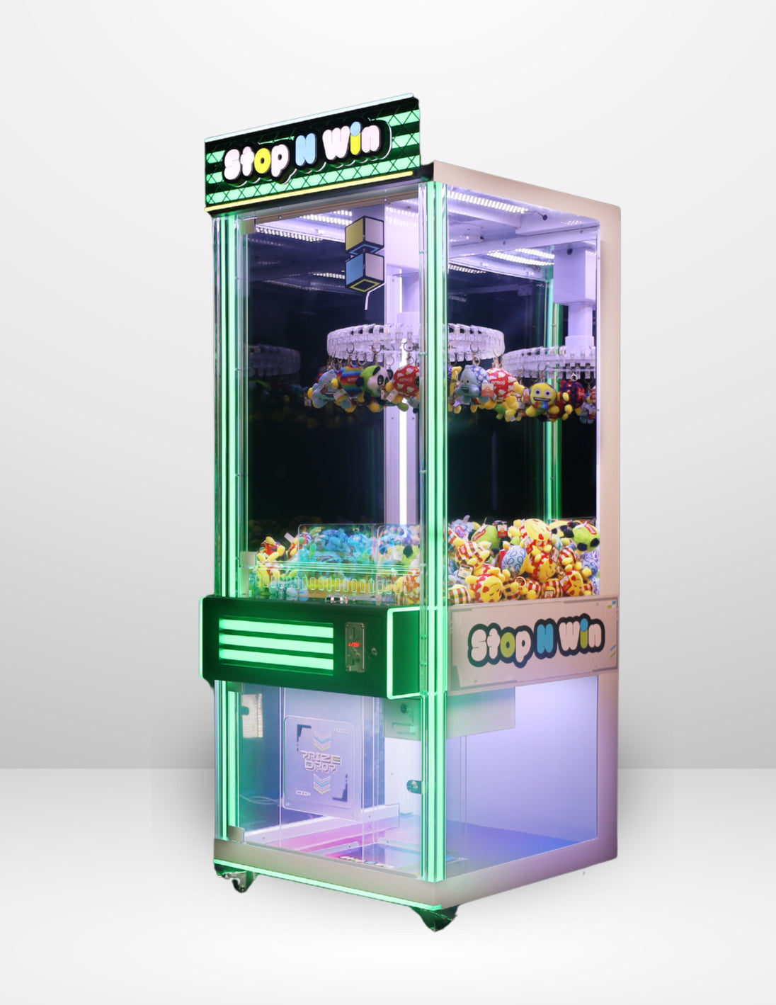 Stop N Win is a thrilling arcade prize game where players test their timing skills to win! Prizes hand on a rotating ring, and players tap a button to align their chosen prize with an arrow.  If timed perfectly, the prize drops delivering instant rewards.  Easy, fun, and perfect for all ages!!