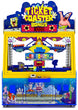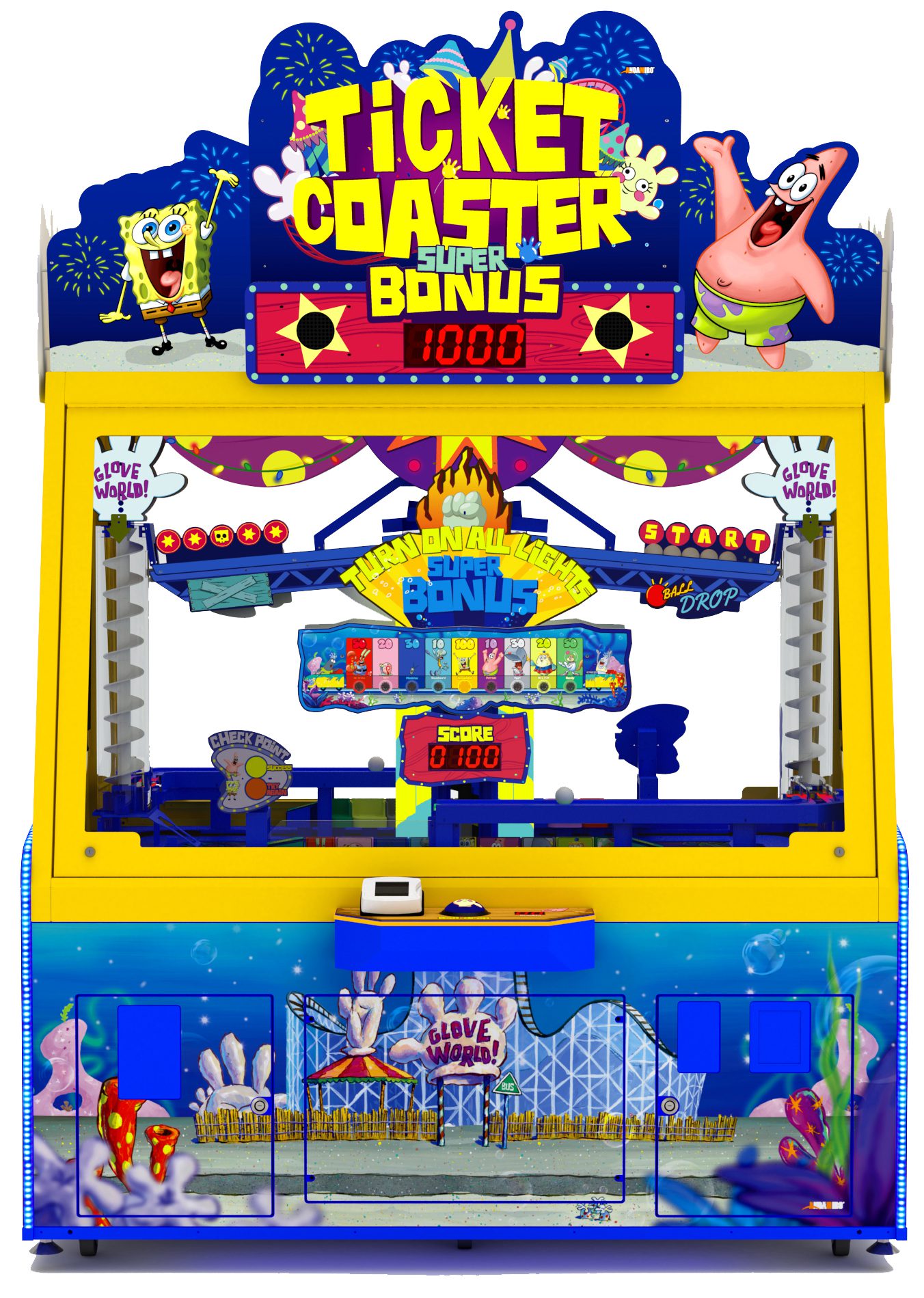 SpongeBob SquarePants Ticket Coaster is an entertaining gravity game for players of all ages. Players start the mechanical action by dropping a ball into a helix launcher, or corkscrew, which in turn deposits the ball onto a track to complete the ride. The object of the game is to accurately time the landing of a ball into the opening of one of the roller coaster cars. There are nine cars with nine corresponding ticket values. When a player lights up all nine ticket values, they win the super bonus. Andamiro’s latest SpongeBob amusement device is packaged in an attractive cabinet that pairs two player stations in an island format. © 2021 Viacom International Inc.