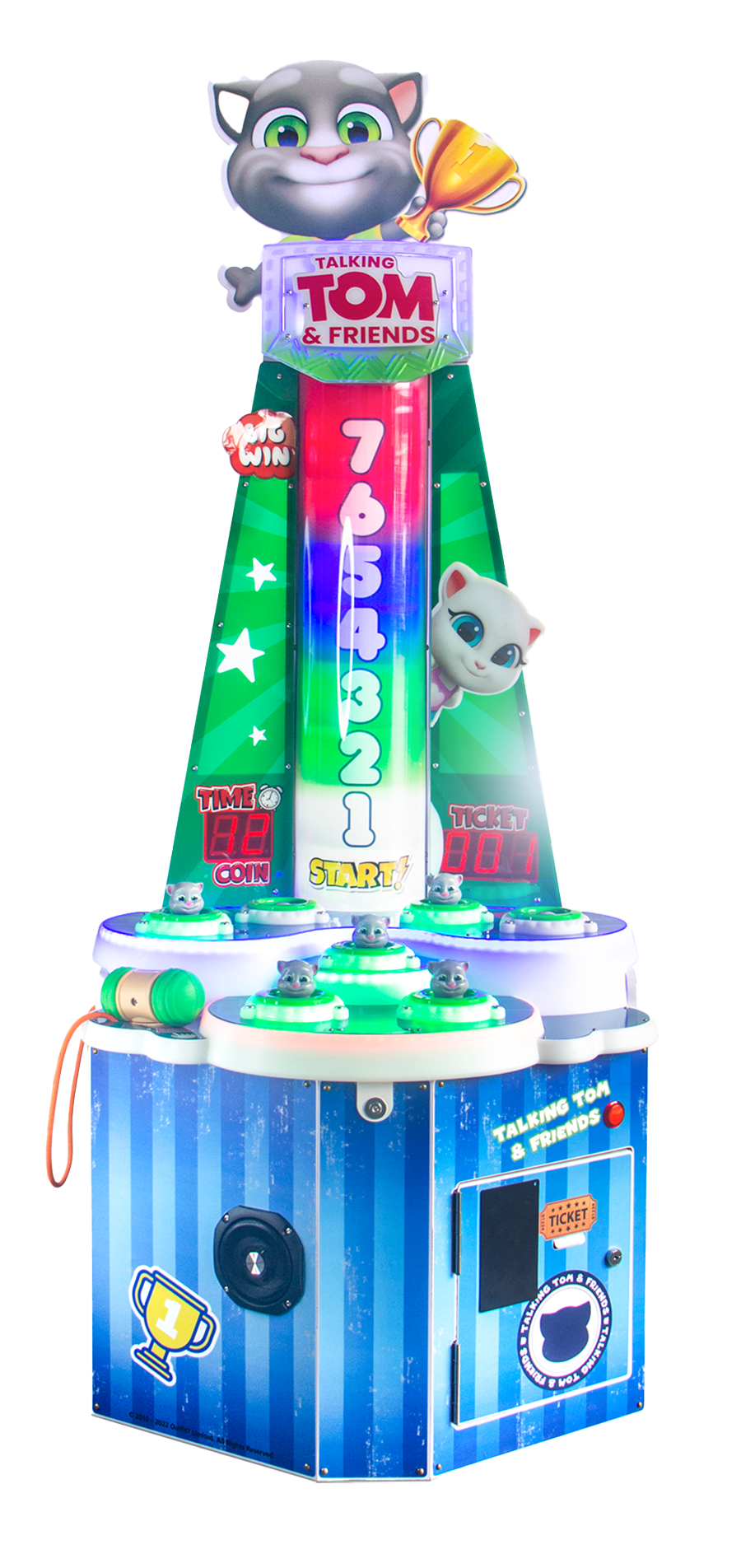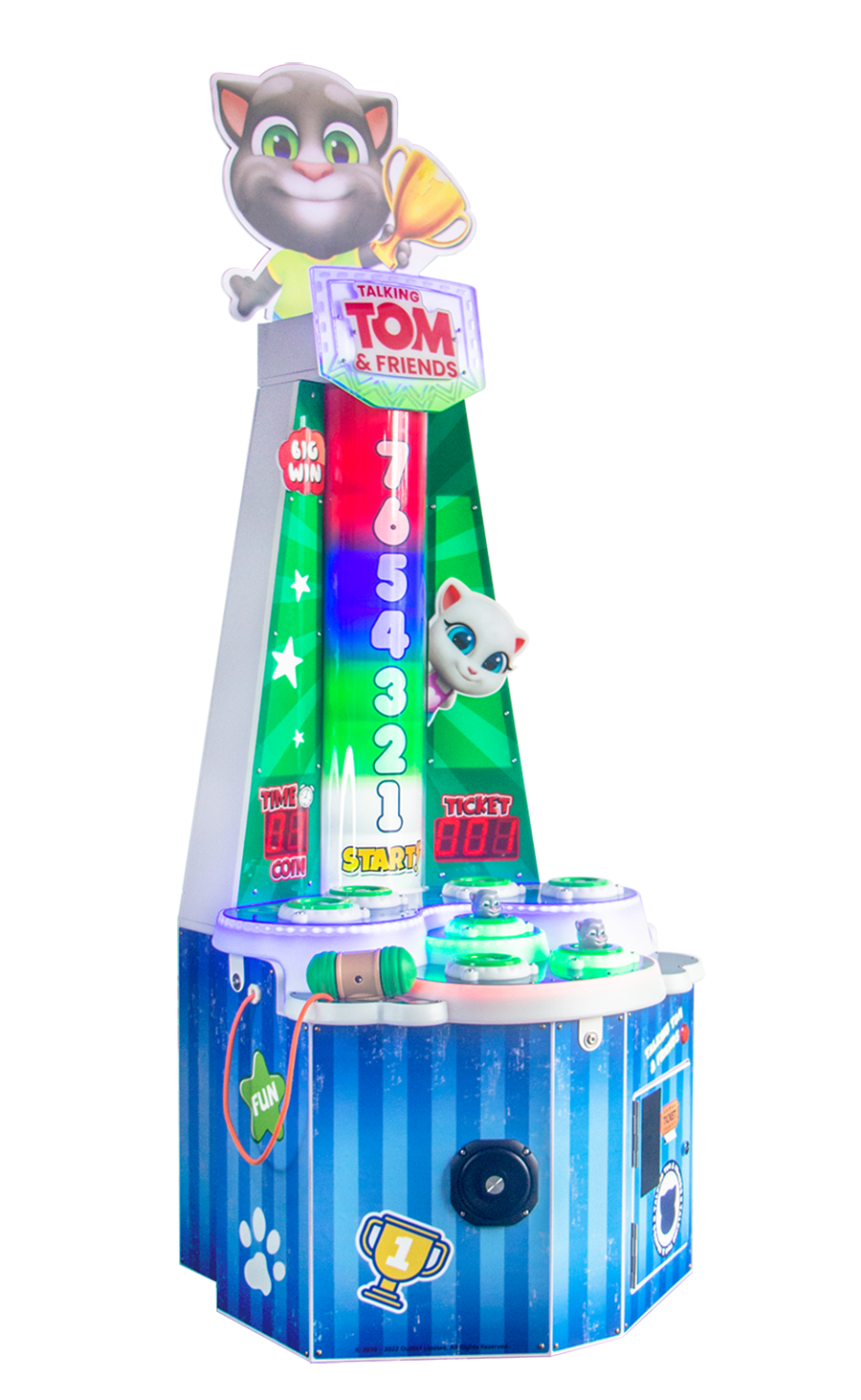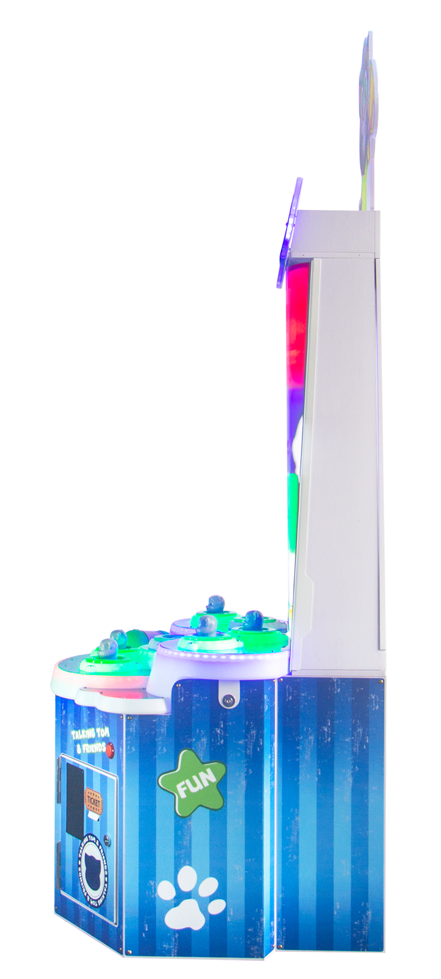 Features include LED lighting, a hidden continuous strike function, seven challenging levels, step-down console and mechanically reliable popping targets. Talking Tom’s compact cabinet size is perfect for all locations, and it can operate in ticket or non-ticket modes. It’s outfitted with a single user station for focused play and maximum longevity.