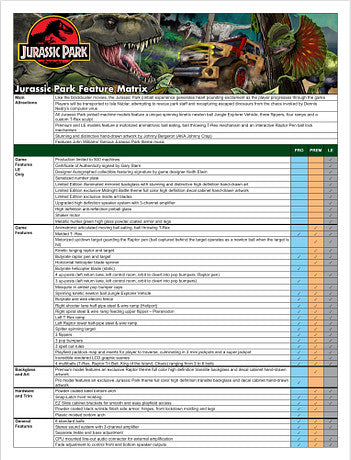 All models include three full-sized flippers, four custom ramps, unique mosquito-in-amber pop bumpers, custom metal horizontal helicopter spinner, spinning "Spitter" target, and in-lane up/down lock post for critical shot setups.